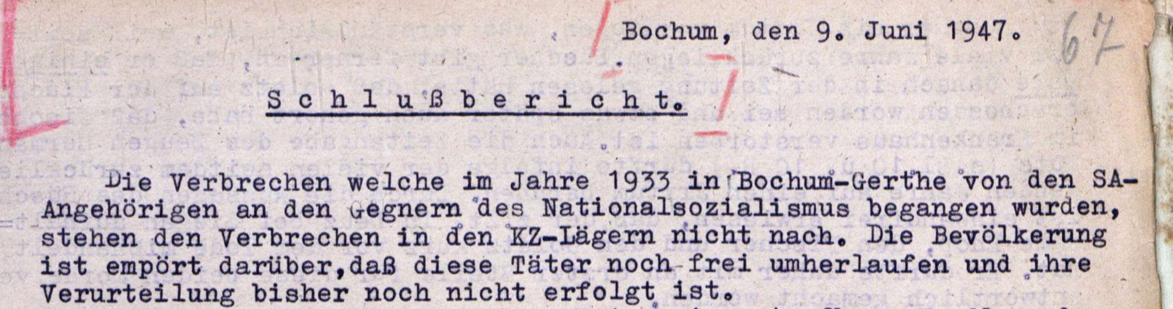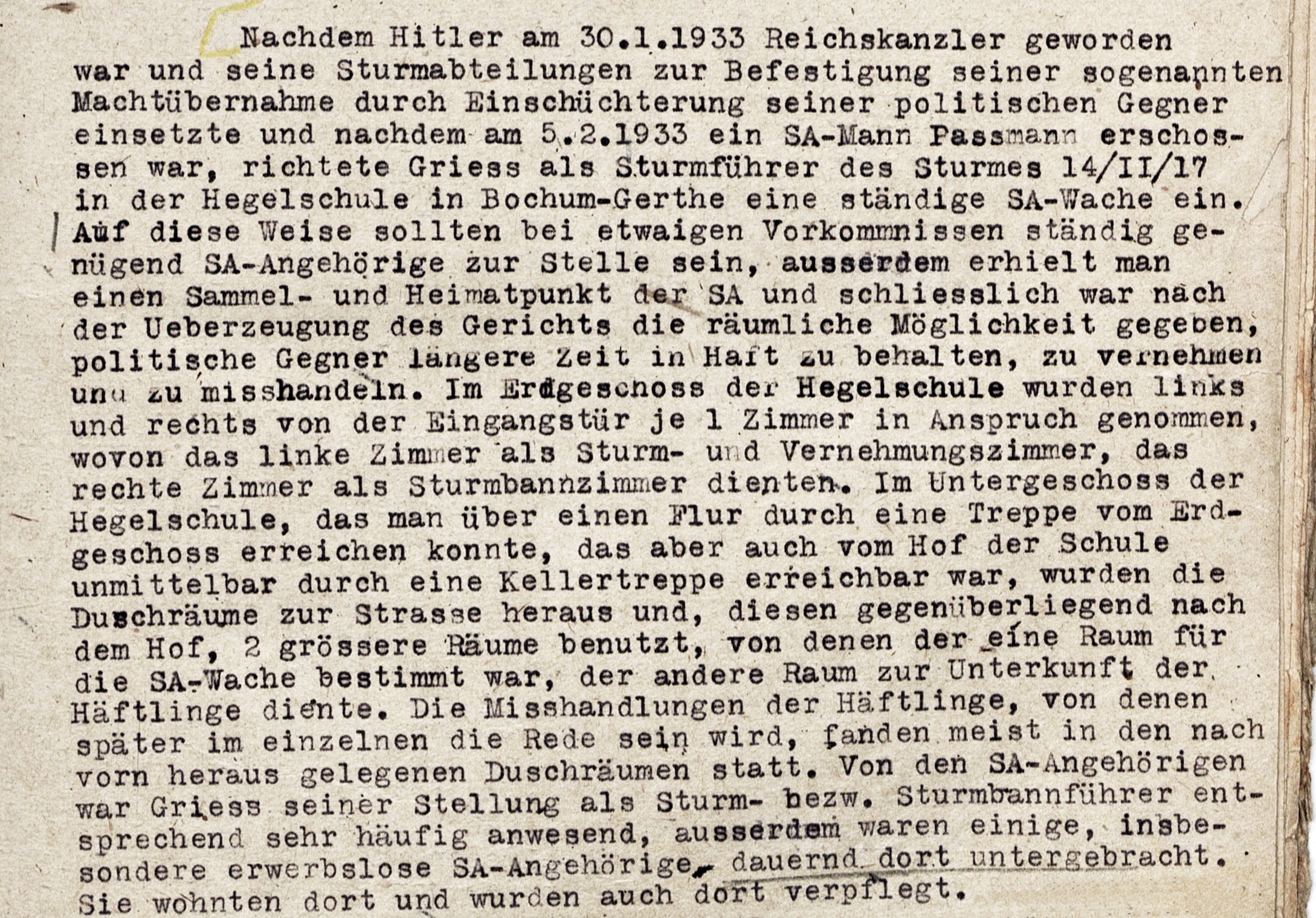 Zahllose Systemgegner (KPD, SPD u. a.) wurden von den ebenso aus Gerthe und Hiltrop stammenden SA-Leuten aus ihren Wohnungen gezerrt, in die Kellerräume der Hegelschule verschleppt, dort eingesperrt, auf das Grausamste erniedrigt, misshandelt und brutal gefoltert. Viele Opfer des Gerther SA-Terrors litten lebenslänglich an den Folgen der Misshandlungen bei den „Verhören“ oder verstarben an den Spätfolgen der Folter.