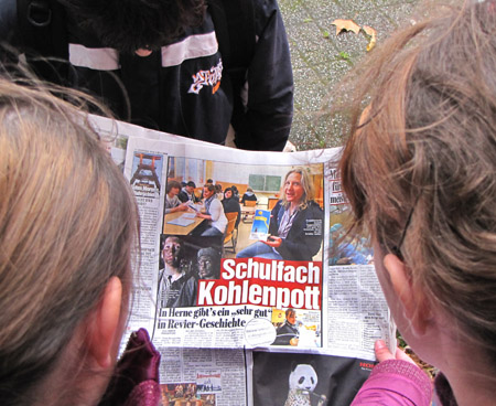 Am Tag zuvor hatte das Fach Kohlengräberland im 10. Jahrgang Besuch von AutorinMaria Maddafari und Fotograf Marc Vollmannshauser von der großen Boulevardzeitung. Aufmerksam geworden war die Bild-Redaktion auf das Thema, nachdem die „Kohlengräber“ im Bundeswett-bewerb „Demokratisch Handeln“ ausgezeichnet worden waren. Die Kursleiter Ulrich Kind und Isa Tappenhölter waren im September gemeinsam mit zwei Schülern nach Berlin gereist, um dort den Preis im Bundesbildungsministerium entgegenzunehmen.