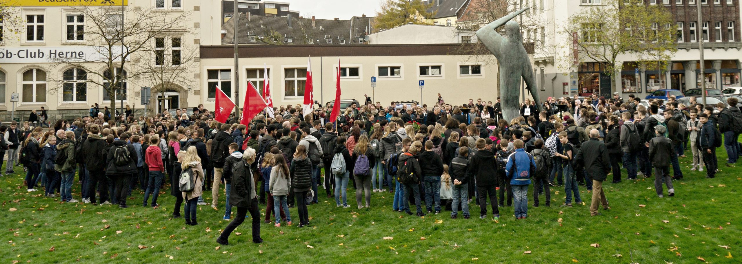 Beteiligt war ebenfalls die SJD Falken Herne und zahlreiche Bürgerinnen und Bürger der Stadt. Oberbürgermeister Frank Dudda hatte den Aufruf zur Teilnahme ausdrücklich unterstützt. In ihrer Ansprache am Mahnmal an der Bebelstraße erinnerten die EFG-Schüler Bahar Celic (16), Eric Kolpatzik (16) und Susan Wilhelm (17) an die Opfer von Gewalt, Rassismus und Rechtsradikalismus. Sie forderten ihre Altersgenossen auf, laut „Nein“ zu sagen gegen Hass und Gewalt gegen schutzsuchende Flüchtlinge, Ausländer, Menschen anderer Gesinnung oder religiöser Orientierung. „Wer Flüchtlinge angreift oder verächtlich macht, greift uns an und macht uns verächtlich. Wer Flüchtlingsunterkünfte anzündet, der steckt auch unsere Heimat in Brand“. Auch Feyza Yanaz und Norbert Arndt vom DGB zogen eine gedankliche Verbindung zwischen den Ereignissen der NS-Zeit und der zunehmenden Zahl rechtsextrem motivierter Straftaten gegen Flüchtlinge. Mit Sorge verwies Arndt auf die um sich greifende Hetze in sozialen Netzwerken und auf rechtspopulistischen Kundgebungen.
