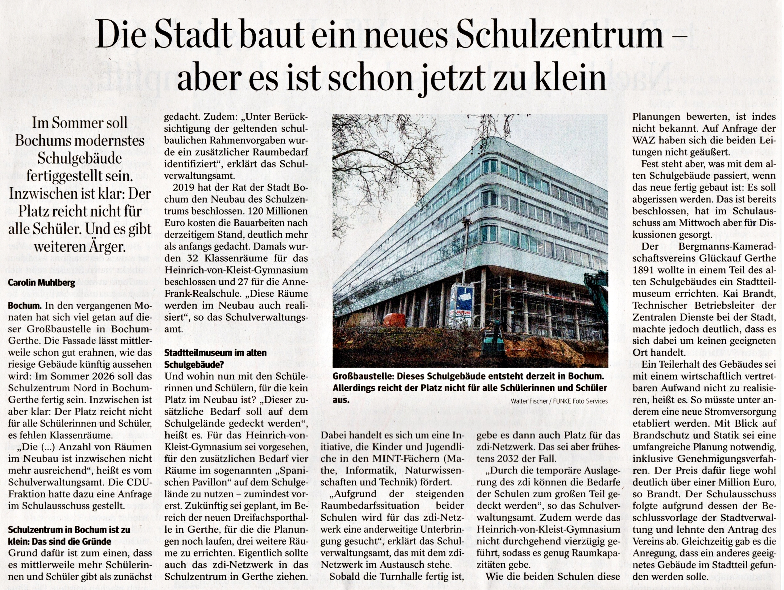 Am 14.01.2026 wurde der gemeinsame Antrag (gem. § 24 GO NRW) des BKV Glückauf Gerthe 1891 e. V., der Kohlengräberland-Geschichtswerkstatt, des Heinrich-von-Kleist-Gymnasiums Bochum und des Gerther Treff e. V. für einen Museums-, Lern- und Begegnungsort in einem Teilgebäude des gegenwärtigen Schulzentrums Gerthe in der 1. Sitzung des Schul- und Bildungsausschusses der Stadt Bochum mehrheitlich (bei 4 Enthaltungen) abgelehnt.