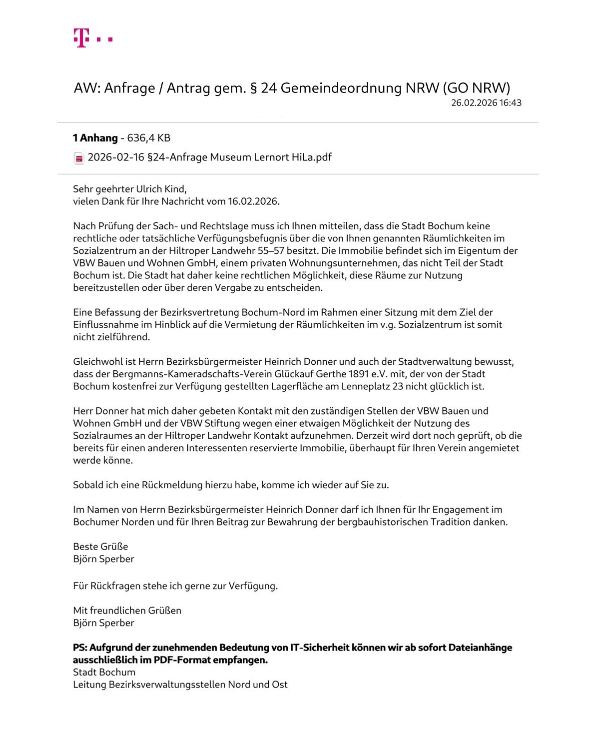 Neben Herrn Dr. Sascha Dewender (CDU) lobten auch die Vertreter der übrigen Ratsfraktionen die engagierte, verlässliche und ehrenamtliche Arbeit der Antragstellenden hinsichtlich der Traditionspflege, Erinnerungs- und Bildungsarbeit im Bochumer Norden. Die Verwaltung wird aufgefordert, eine alternative Räumlichkeit zu suchen.