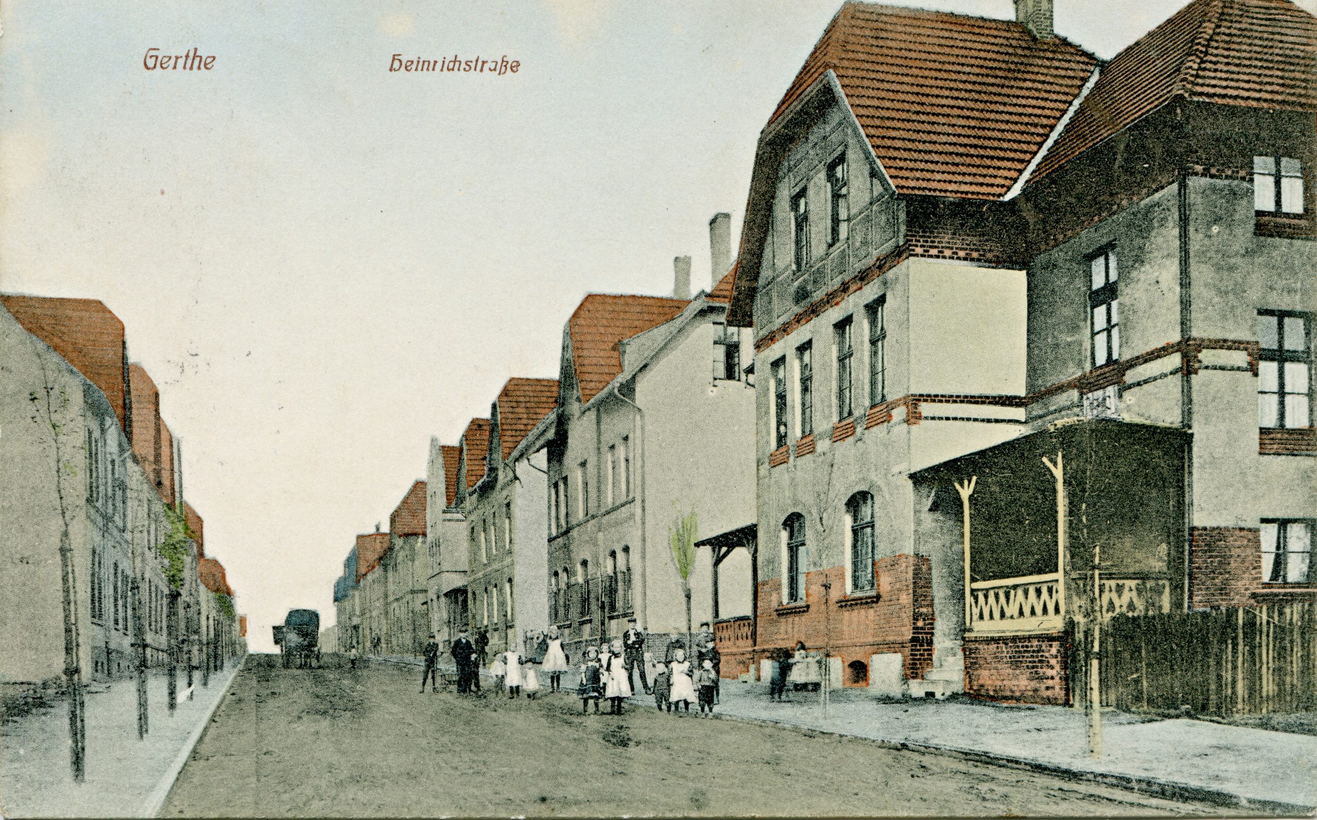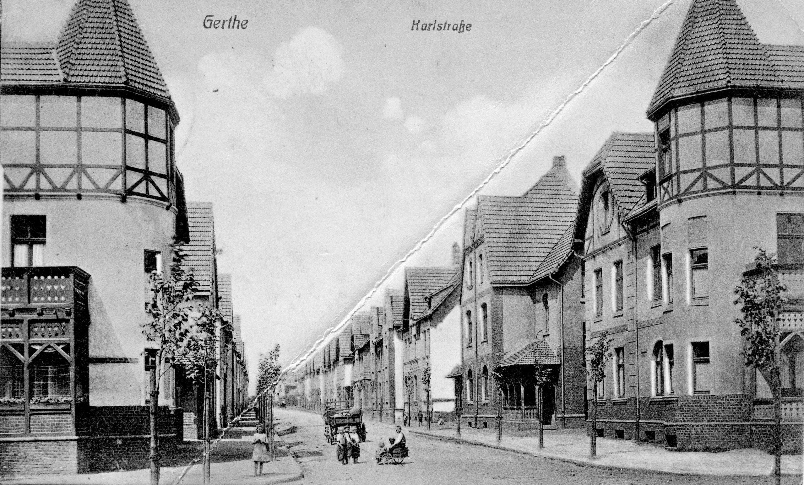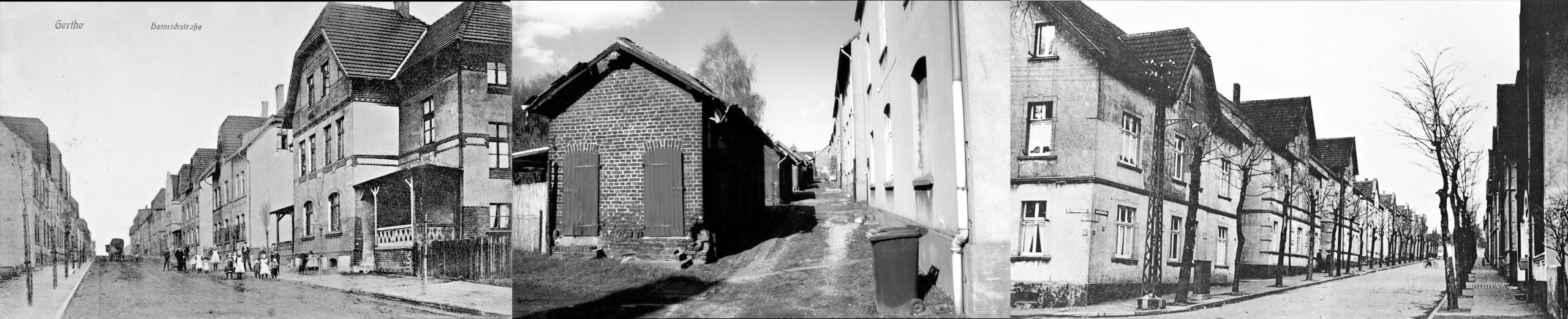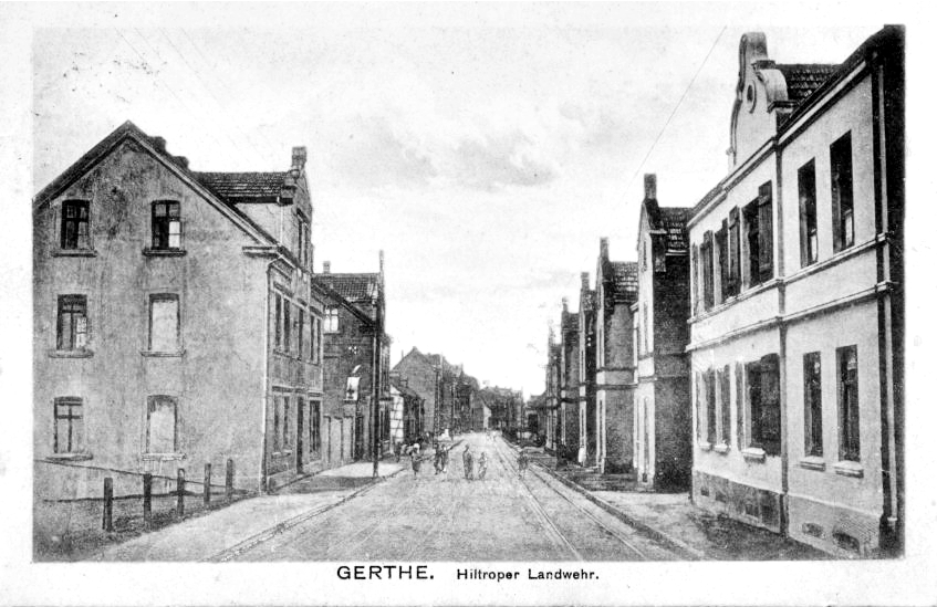 „Die Gemeinde Gerthe war um das Jahr 1870 noch eine kleine Bauernschaft, die nur wenige Gehöfte und Kotten aufzuweisen hatte. Die meisten Wohnstätten lagen südlich der heutigen Heinrichstraße […]. Die berufstätige Bevölkerung bestand aus Landwirten, Köttern, Handwerkern und aus Bergleuten, die auf den Zechen der umliegenden Gemeinden arbeiteten.“