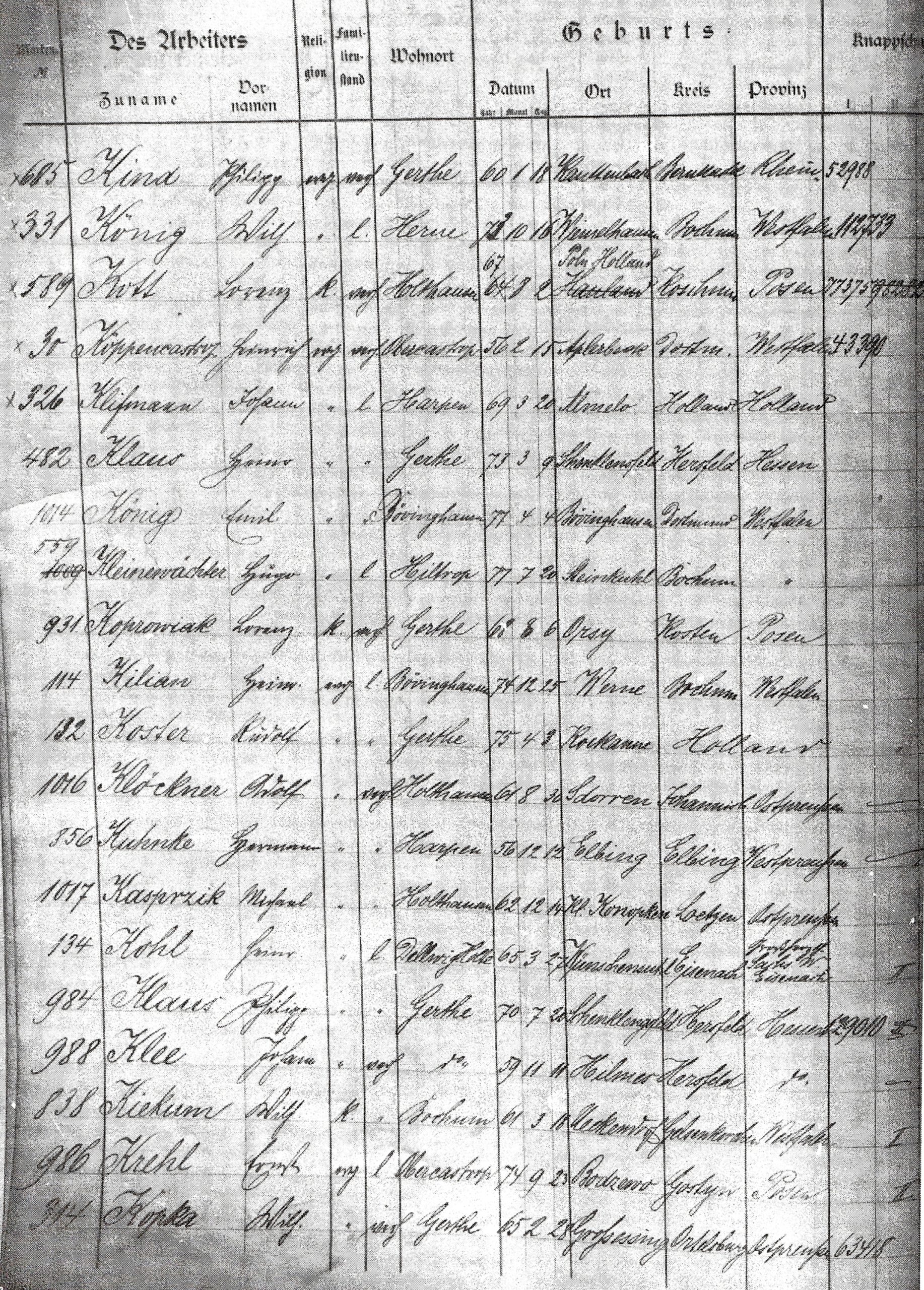 Zu Beginn des letzten Jahrhunderts fanden sich Familienväter und Ledige aus Westfalen, Hessen, Thüringen, Ostpreußen und Westpreußen, der Provinz Posen, Land Polen, Galizien, Ungarn, Kärnten, Krain [Niederschlesien], Italien, Holland, und Böhmen unter der Belegschaft der Zeche Lothringen.[4]